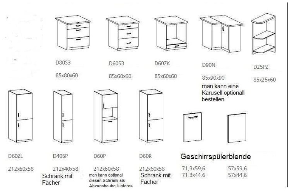 Um den unverbindlichen Kostenvoranschlag Ihre Küche zu machen senden sie uns per Email Bezeichnung einzelne Küchen Elemente.Bei Fragen bitte anrufen oder schreiben (Email) wir helfen gerne bei der Zusammenstellung Ihre Küche.Die Abmessung der unterschränke OHNE ARBEITSPLATTE SIND 47 CM TIEF.MIT ARBEITSPLATTE 60CM TIEF